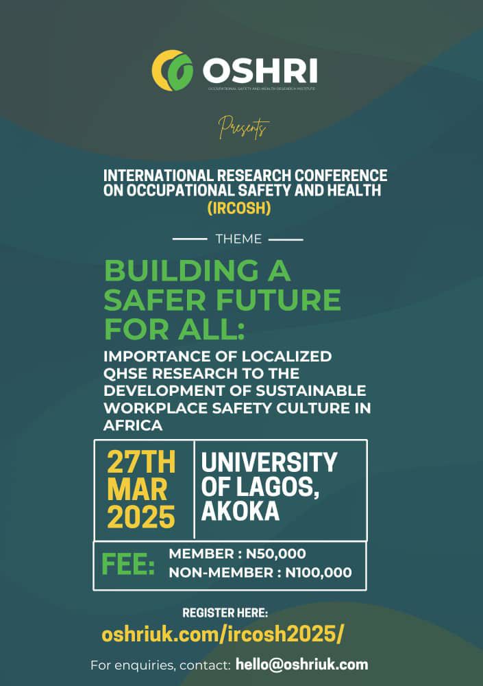 The International Research Conference on Occupational Safety and Health (IRCOSH) 2025 has been scheduled to hold on March 27, 2025, at the Faculty of Education Hall, University of Lagos, Akoka, Yaba, Lagos.