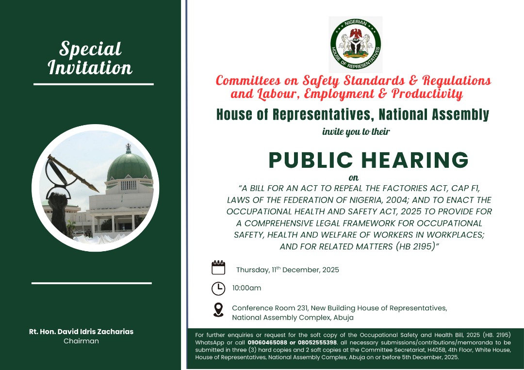 Nigeria is on the verge of one of its most significant workplace safety reforms in decades as the House of Representatives prepares for a public hearing on the Occupational Health and Safety Bill, 2025 (HB 2195).