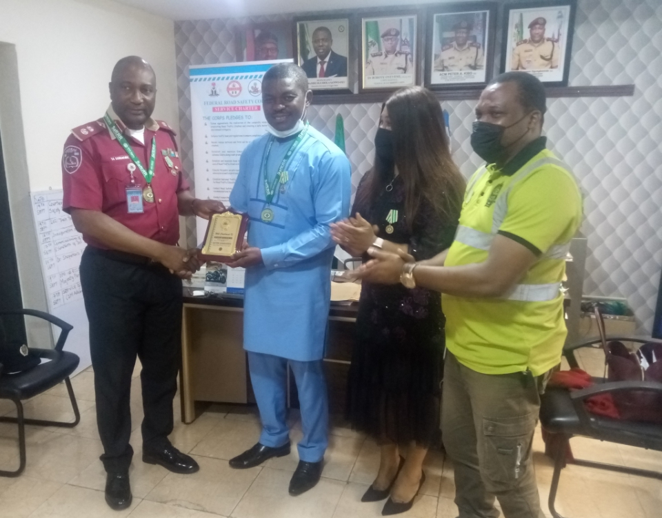 (M) Lagos State Sector Commander of Federal Road Safety Corps, Olusegun Ogungbemide, World Safety Organization Ambassadors and Executive Director, HSENations International, Femi Da-silva, at FRSC Lagos on September 14, 2021.