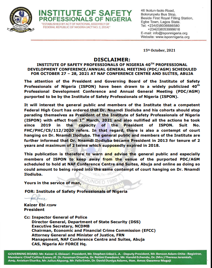 The Institute of Safety Professionals of Nigeria (ISPON) has warned the public against any Professional Development Conference/Annual General Meeting (PDC/AGM) stressing it has not called for any yet, hence they should be wary of any such development.