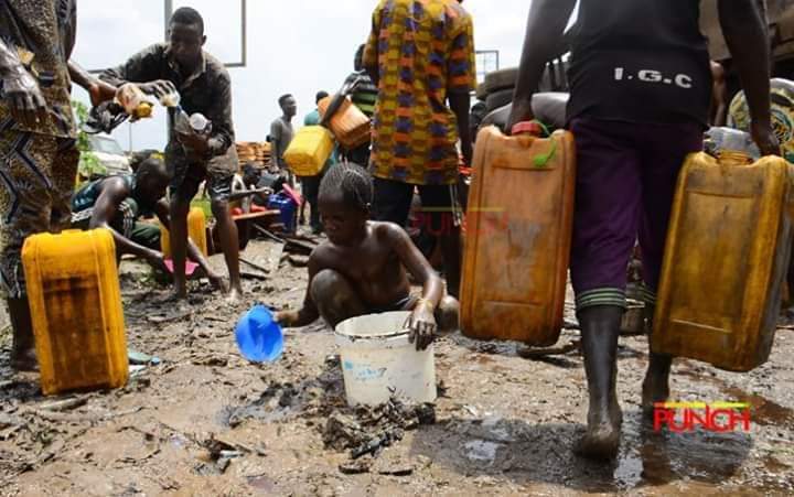 The people were seen, both old and young children, in gallons and containers as they scooped fuel.